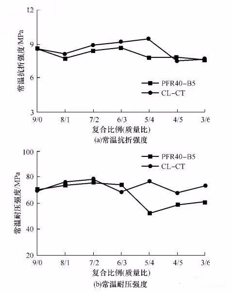 ▲图6 复合氧化铝微粉种类及其复合比例对烘干后试样常温抗折强度和常温耐压强度的影响
